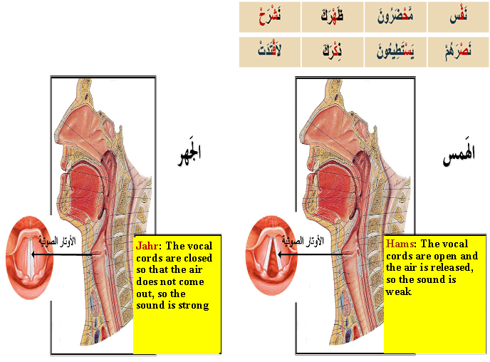 جريان النّفَس عند النطق بالحرف لضعف الاعتماد على المخرج Means the continuation of the breath when pronouncing the letter due to weakness in its origin, causing weakness in its reliance on its makhraj Hams letters: فحثَّه شخص سكت ( ف ح ث هـ ش خ ص س ك ت ) Examples: |